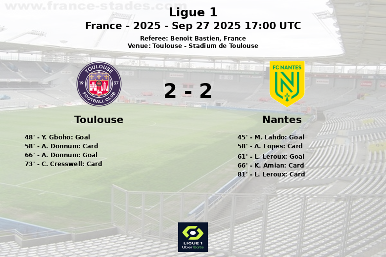 Toulouse, France – Un match plein de rebondissements s’est déroulé au Stadium de Toulouse, où Toulouse et Nantes ont fait match nul lors d’une rencontre de Ligue 1. Nantes a pris l’avantage juste avant la mi-temps avec un but de M. Lahdo, suscitant l’espoir parmi ses supporters.