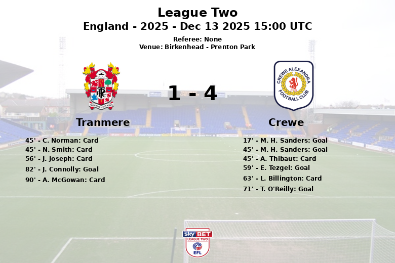 Après la pause, Crewe a continué à presser, et E. Tezgel a marqué sur penalty à la 59e minute, augmentant encore l’avantage. T. O’Reilly a couronné une excellente performance individuelle avec un but à la 71e minute, cette fois assisté par Sanders. Un but contre son camp de J. Connolly à la 82e minute a offert une maigre consolation à Tranmere, mais cela n’a pas suffi à changer le cours du match. Tranmere a récolté un total de quatre cartons jaunes au cours du match. Bien qu’ils aient effectué 18 tirs, seuls cinq ont été cadrés. Crewe, avec moins de possession et de tirs, a fait preuve d’une plus grande précision et efficacité en attaque.