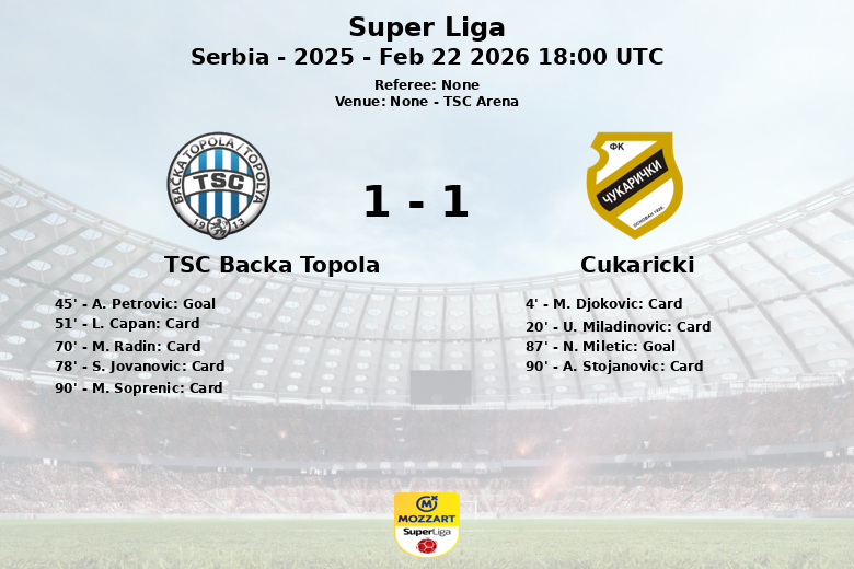 TSC Arena, Serbie – Un match disputé et chargé de cartons s’est déroulé lors de la 24e journée de la Super Liga Serbe entre le TSC Backa Topola et le Cukaricki. La rencontre, jouée le 22 février 2026, s’est soldée par un match nul 1-1 qui n’a laissé personne indifférent.