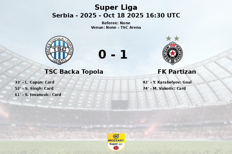 Le FK Partizan a réussi à s’imposer face au TSC Backa Topola lors de la 12ème journée de la Super Liga serbe, au TSC Arena, avec un score final de 1 à 0. Le match, disputé le 18 octobre 2025, s’est caractérisé par un jeu intense et tactique.