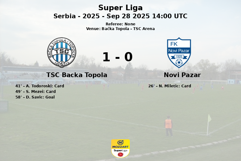 Bačka Topola, Serbie – Dans un match disputé à la TSC Arena, le TSC Backa Topola a remporté une victoire étroite contre Novi Pazar, lors de la dixième journée de la Super Liga serbe. L’unique but du match est survenu à la 58e minute, œuvre de D. Savic, après une action où le contrôle du ballon a échappé à la défense adverse.