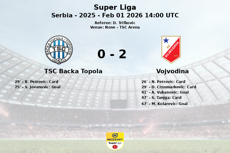 Remplacements dans l’quipe de tsc backa topola: À la 60e minute, B. Petrovic est entré et S. Tomovic est sorti., À la 60e minute, B. Jovicic est entré et S. Jovanovic est sorti., À la 60e minute, A. Todoroski est entré et V. Mboungou est sorti., À la 78e minute, L. Capan est entré et M. Satara est sorti., À la 81e minute, R. Bosic est entré et D. Savic est sorti.