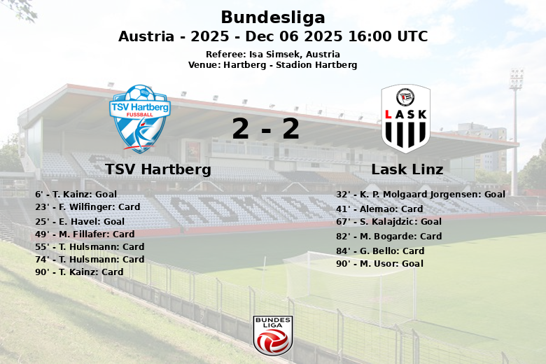 Remplacements dans l’quipe de tsv hartberg: À la 46e minute, M. Hennig est entré et M. Fillafer est sorti., À la 68e minute, Y. Diarra est entré et D. Prokop est sorti., À la 76e minute, M. Hoffmann est entré et A. Helac est sorti., À la 90e minute, D. Kovacevic est entré et J. Golles est sorti.