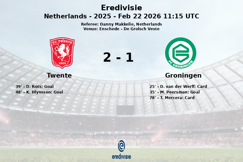 Dans un match vibrant qui s’est déroulé au De Grolsch Veste à Enschede, Twente a vaincu Groningen avec un score final de 2 à 1. Le match, correspondant à la 24e journée de l’Eredivisie, a été arbitré par Danny Makkelie.
