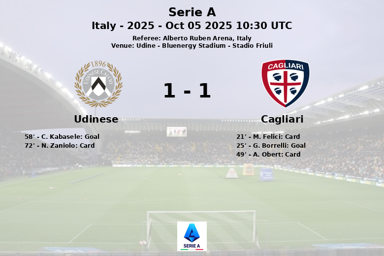 Udine, Italie – L’Udinese et Cagliari ont fait match nul lors d’un match de Serie A qui s’est déroulé au Bluenergy Stadium – Stadio Friuli. Le match, arbitré par Alberto Ruben Arena, faisait partie de la sixième journée de la saison régulière. L’Udinese a dominé la possession avec 59% et a généré plus d’occasions de marquer, enregistrant 23 tirs au total, dont 4 cadrés. Cependant, c’est Cagliari qui a frappé en premier grâce à un but de G. Borrelli à la 25e minute, suite à une passe décisive de M. Adopo.