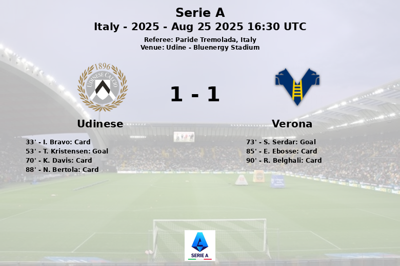 Le match a été caractérisé par un jeu physique, avec un total de 24 fautes commises entre les deux équipes. L’arbitre Paride Tremolada a averti quatre joueurs de l’Udinese (I. Bravo, K. Davis, N. Bertola) et deux joueurs de Vérone (E. Ebosse, R. Belghali). Malgré l’intensité, aucune équipe n’a subi d’expulsion. L’Udinese a obtenu 5 corners, tandis que Vérone n’en a eu qu’un. Le match s’est terminé par un match nul, laissant un sentiment mitigé pour les deux équipes.