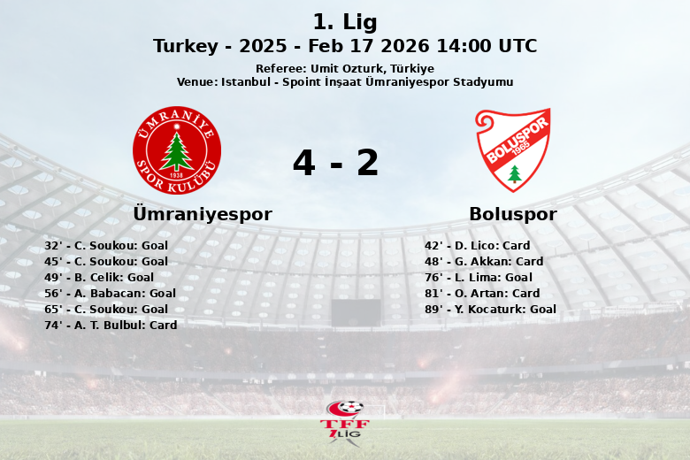 C. Soukou a été la star du match, ouvrant le score à la 32e minute avec une finition précise, sur une passe de J. Bardhi. Soukou a eu la chance d’aggraver le score peu avant la mi-temps, mais a manqué un penalty à la 45e minute. Cependant, Ümraniyespor ne s’est pas découragé et en seconde période, B. Celik, A. Babacan, et C. Soukou à nouveau ont augmenté l’avance avec des buts aux 49e, 56e et 65e minutes respectivement.