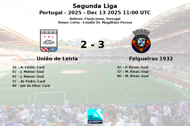 Felgueiras 1932 a ouvert le score à la 32e minute grâce à un but de P. Rosas. Cependant, l’União de Leiria a réagi avec force. J. Munoz a égalisé à la 41e minute, grâce à une passe décisive de Lucho Vega, puis a donné l’avantage à son équipe juste avant la mi-temps, à la 45e minute, avec un but grâce à une passe décisive de D. Michel.