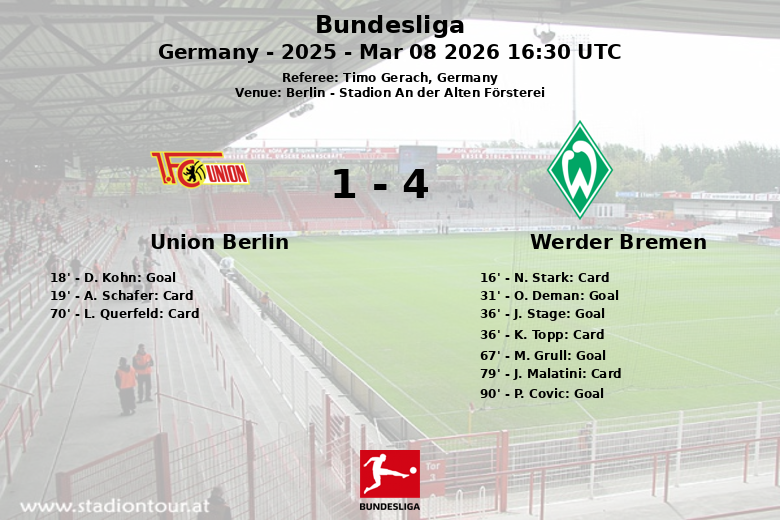 Berlin – Dans un match disputé au Stadion An der Alten Försterei, le Werder Brême a battu l’Union Berlin avec un score final de quatre à un. Le match, correspondant à la 25e journée de Bundesliga, a été marqué par l’intensité et des moments clés dès le début.