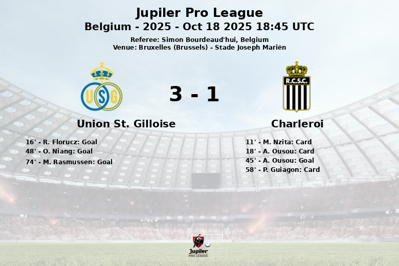 Bruxelles (Brussels) – L’Union St. Gilloise a vaincu Charleroi lors d’un match comptant pour la 11e journée de la Jupiler Pro League, qui s’est déroulé au Stade Joseph Mariën. Le match, arbitré par Simon Bourdeaud’hui, a été caractérisé par un rythme intense et des opportunités pour les deux équipes, bien que l’efficacité de l’Union St. Gilloise ait finalement fait la différence.
