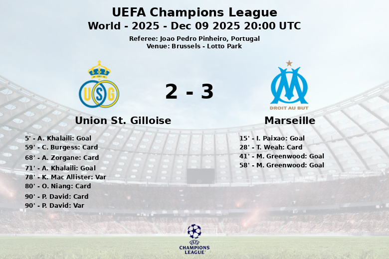 En seconde période, Greenwood a creusé l’écart pour Marseille à la 58e minute, grâce à une passe décisive de M. O’Riley. L’Union St. Gilloise a riposté, A. Khalaili marquant son deuxième but du match à la 71e minute, sans assistance, réduisant l’écart. L’équipe locale a poussé pour égaliser, mais un but de K. Mac Allister a été refusé pour hors-jeu à la 78e minute, après examen du VAR. Dans les derniers instants, un autre but de l’Union St. Gilloise, cette fois par P. David, a également été refusé pour hors-jeu suite à l’intervention du VAR.