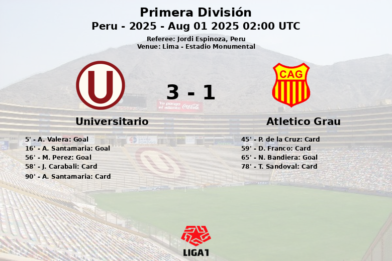 Malgré une plus grande possession du ballon (58%), Atlético Grau n’a pas réussi à concrétiser ses occasions. La première mi-temps s’est terminée par un carton jaune pour P. de la Cruz de l’équipe visiteuse. En seconde période, Universitario a continué à dominer, et M. Perez a marqué le troisième but à la 56e minute, sur une passe de J. Carabali. Le match est devenu plus tendu, avec des cartons jaunes pour J. Carabali d’Universitario et D. Franco d’Atlético Grau.