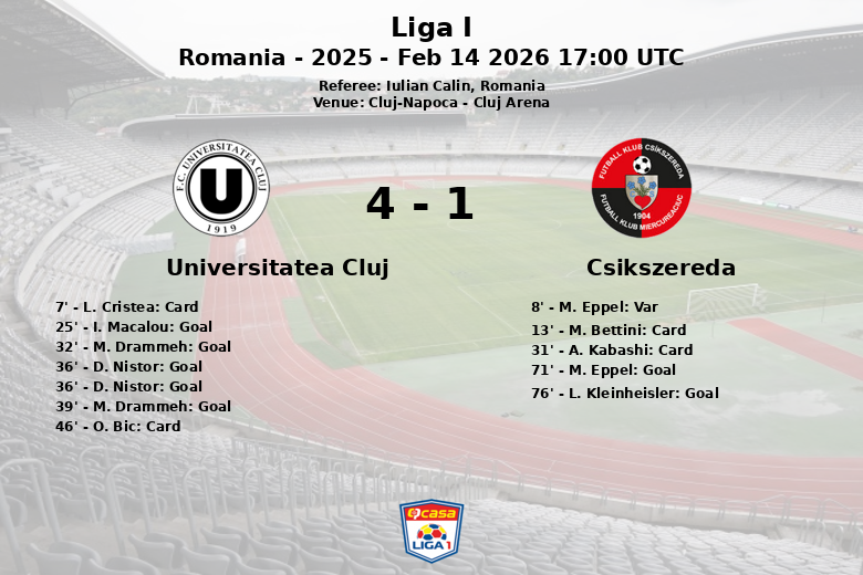 Le match a commencé avec intensité, avec un but refusé à M. Eppel de Csikszereda pour hors-jeu à la 8e minute. Universitatea Cluj a répondu avec force, ouvrant le score à la 25e minute grâce à un but de I. Macalou, servi par J. Lukic. M. Drammeh a creusé l’écart à la 32e minute. Un penalty manqué par D. Nistor à la 36e minute n’a pas empêché Nistor lui-même de marquer quelques instants plus tard. Drammeh a marqué à nouveau à la 39e minute, consolidant l’avantage local.