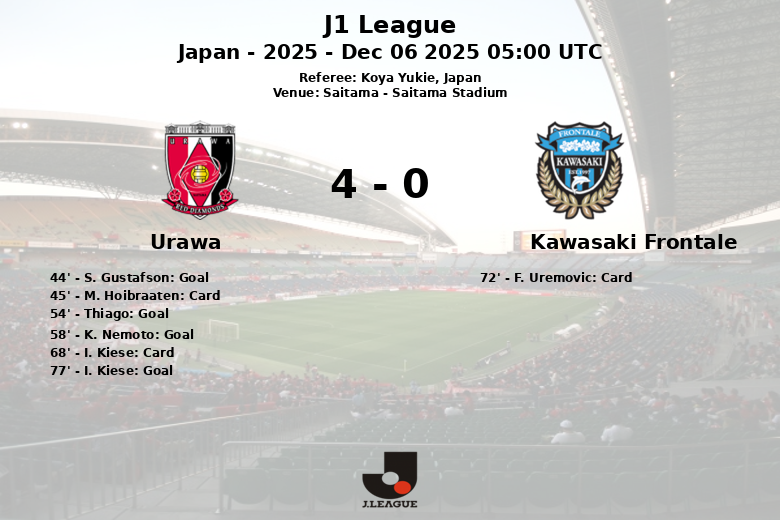 Malgré une possession de balle de 41 % pour Kawasaki Frontale, Urawa a imposé son jeu et son efficacité. Le premier but est arrivé à la 44e minute, marqué par S. Gustafson sur une passe de Matheus Savio, juste avant la mi-temps. La seconde mi-temps a été un monologue d’Urawa, avec des buts de Thiago à la 54e minute, de K. Nemoto à la 58e minute et enfin, de I. Kiese à la 77e minute, qui a également reçu un carton jaune à la 68e minute. M. Hoibraaten a également été averti à la 45e minute.