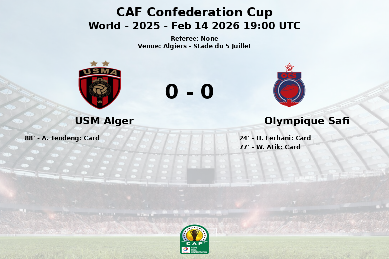 Alger, le 14 février 2026 – Lors d’un match disputé au Stade du 5 Juillet, l’USM Alger et l’Olympique Safi se sont affrontés dans le cadre de la Coupe de la Confédération de la CAF. L’équipe locale, l’USM Alger, a largement dominé la possession du ballon, atteignant 73 % contre 27 % pour son adversaire.