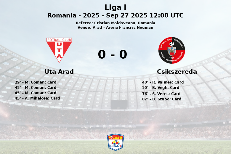 Arad a été témoin d’une rencontre chargée de tension en Liga I, où l’UTA Arad et le Csikszereda se sont affrontés à l’Arena Francisc Neuman. Le match, arbitré par Cristian Moldoveanu, s’est déroulé avec un niveau d’intensité élevé, marqué par de nombreux avertissements et une expulsion qui a conditionné le déroulement du jeu.