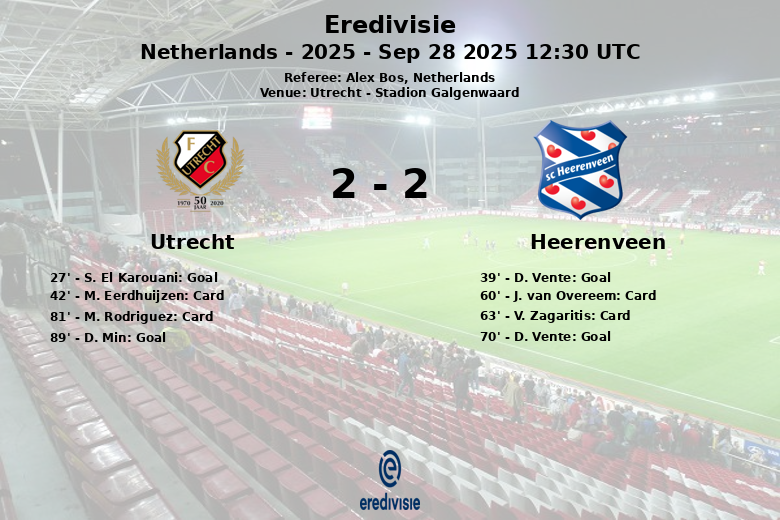 En deuxième mi-temps, Heerenveen a pris l’avantage grâce à un autre but de D. Vente à la 70e minute. Alors qu’il semblait qu’Heerenveen se dirigeait vers la victoire, D. Min a marqué pour Utrecht à la 89e minute, scellant le match nul final. Le match a été caractérisé par un milieu de terrain disputé, reflété dans la possession du ballon : 52% pour Utrecht et 48% pour Heerenveen. Utrecht a tenté plus de tirs, avec 14 au total, dont 5 cadrés. De son côté, Heerenveen a réalisé 9 tirs, dont 4 dirigés vers le but. L’intensité du jeu s’est également traduite par un total de 12 fautes pour chaque équipe, et deux cartons jaunes pour chaque camp, pour Utrecht M. Rodriguez et M. Eerdhuijzen et pour Heerenveen J. van Overeem et V. Zagaritis. L’arbitre Alex Bos a eu du travail lors du match comptant pour la 7e journée de l’Eredivisie.