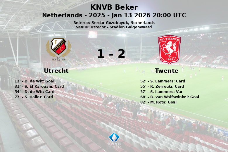 Le match a été marqué par son intensité, reflétée par les nombreux cartons jaunes distribués aux deux équipes. S. El Karouani, D. de Wit et S. Haller ont été avertis pour Utrecht, tandis que S. Lammers et R. Zerrouki ont écopé d’un carton jaune pour Twente. Un but de S. Lammers a été refusé par la VAR à la 57ème minute.