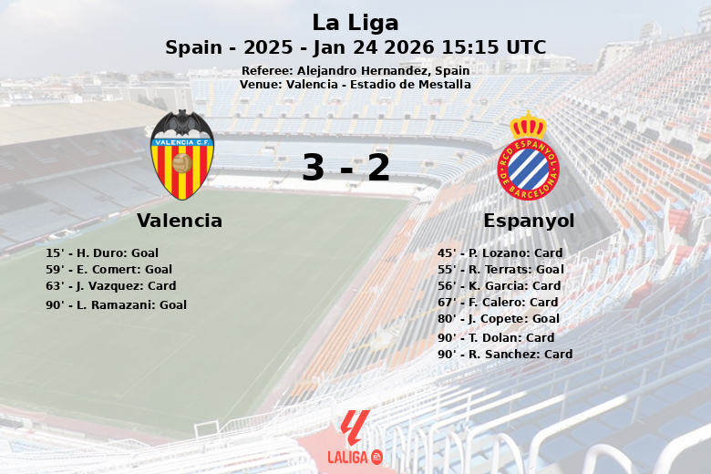 Valence, Espagne – Le stade de Mestalla a été témoin d’un match vibrant et plein de rebondissements, où Valence a vaincu l’Espanyol lors d’un affrontement correspondant à la 21e journée de La Liga. Le match, disputé le 24 janvier 2026, s’est terminé sur le score de Valence 4 – Espanyol 2.