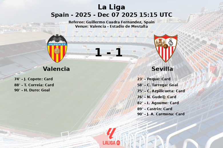 Le match a été marqué par de nombreux avertissements. Peque de Séville a reçu le premier carton jaune à la 23e minute. La deuxième mi-temps a apporté plus de tension et de cartons pour les deux équipes, en particulier pour Séville. À la 58e minute, C. Tarrega de Séville a marqué un but contre son camp, donnant l’avantage à Valence. Séville s’est battu pour l’égalisation, mais a trouvé une défense valencienne bien organisée. Dans les dernières minutes, Valence a scellé le match avec un but de H. Duro à la 90e minute, sur une passe décisive de F. Ugrinic. Malgré le fait d’avoir généré plus de tirs, Séville n’a réussi à cadrer qu’un seul tir. Valence, avec moins de tirs, s’est avéré plus efficace. L’arbitre a été contraint de montrer de nombreux cartons jaunes : cinq à Séville et deux à Valence, reflétant l’intensité avec laquelle le match a été joué.