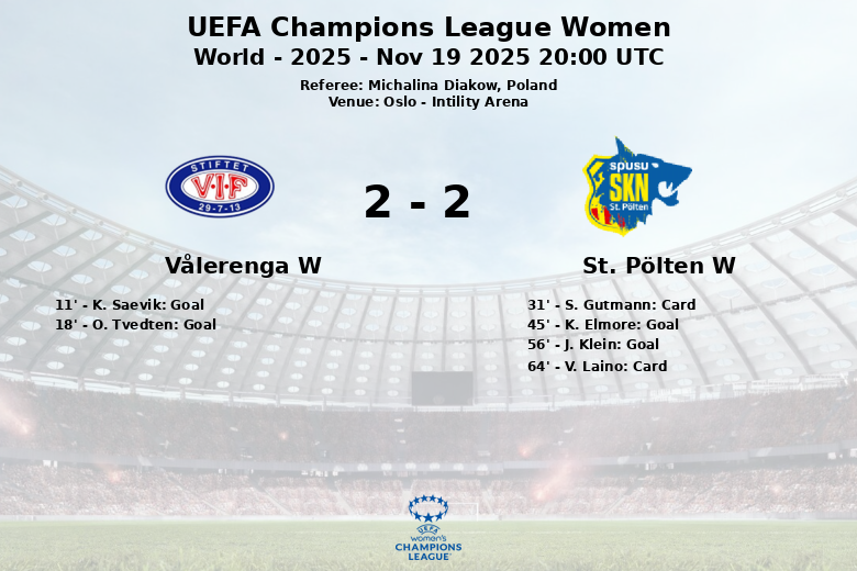 Malgré une plus grande possession de balle de Vålerenga (54% contre 46% pour St. Pölten), et en générant plus de tirs (17 contre 7), St. Pölten W a fait preuve d’une grande efficacité en convertissant ses occasions. Le match a été dirigé par l’arbitre polonaise Michalina Diakow, qui a montré des cartons jaunes à S. Gutmann (31e minute) et V. Laino (64e minute) du St. Pölten W. Au final, un match nul qui laisse la définition du groupe ouverte.