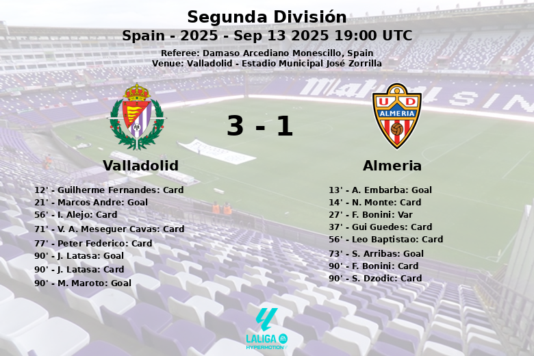La seconde mi-temps a continué sur un rythme effréné. S. Arribas a transformé un penalty pour Almeria à la 73e minute, égalisant le score et créant une grande tension sur le terrain. Cependant, dans les dernières minutes, Valladolid a montré sa détermination. J. Latasa a marqué sur penalty à la 90e minute, et M. Maroto a scellé la victoire avec un but dans le temps additionnel, déclenchant l’euphorie dans les tribunes locales. Le match a été ponctué de cartons jaunes, reflétant l’intensité avec laquelle les deux équipes se sont battues pour la victoire. Valladolid a terminé avec 5 cartons, tandis qu’Almeria en a également accumulé 5.