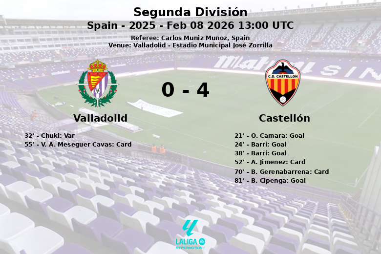 Castellón a fait preuve d’une grande efficacité devant le but. O. Camara a ouvert le score à la 21e minute, sur une passe décisive de B. Gerenabarrena. Peu de temps après, Barri a creusé l’écart avec un doublé aux 24e et 38e minutes, le deuxième sans passe décisive. Valladolid a tenté de réagir, mais un but de Chuki a été refusé par la VAR pour hors-jeu à la 32e minute. Dans la dernière ligne droite du match, B. Cipenga a scellé la victoire de Castellón à la 81e minute, sur une passe décisive de A. Calatrava.
