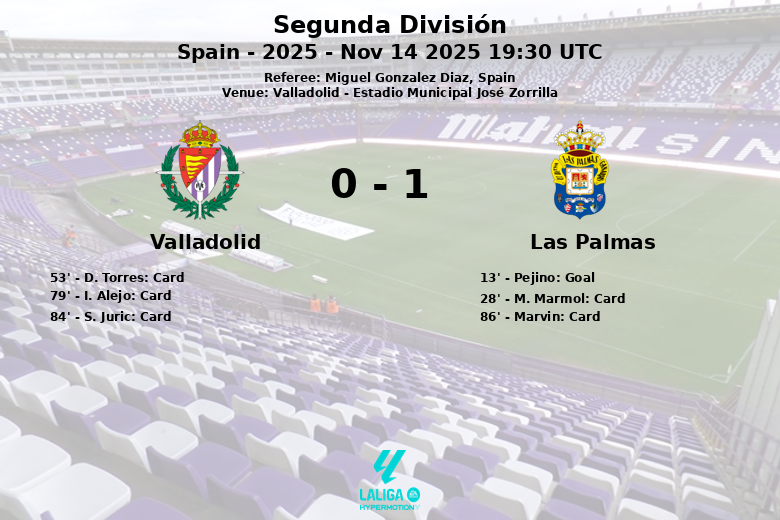 Valladolid, Espagne – Lors d’un match comptant pour la 14e journée de la Segunda División, Las Palmas a réussi à s’imposer face à Valladolid au stade municipal José Zorrilla. L’unique but du match, marqué par Pejino à la 13e minute sur une passe décisive de K. Rodriguez, a suffi à l’équipe des îles Canaries pour ramener les trois points à la maison.