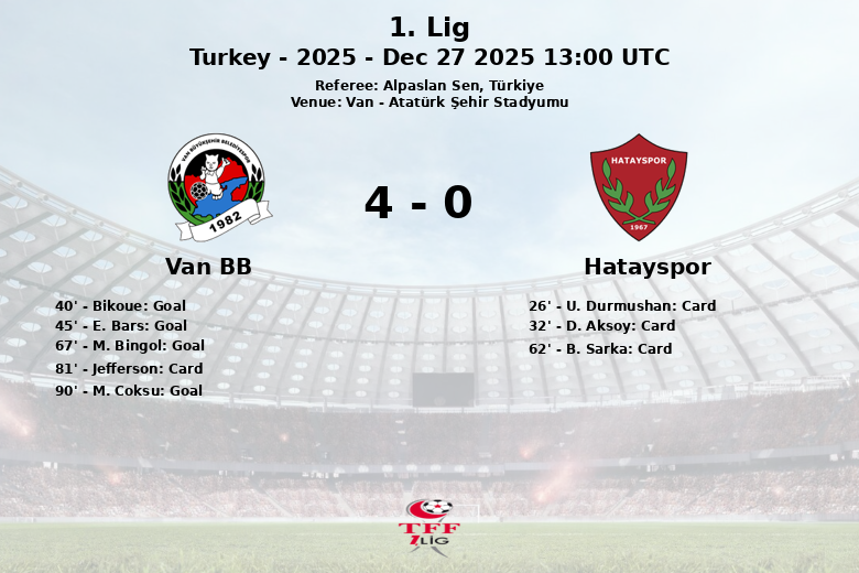 Le score a été ouvert à la 40e minute par un but de Bikoue, suite à une action sans passe décisive directe. Avant la mi-temps, Van BB a étendu son avance avec un but de E. Bars à la 45e minute, sur une passe de Jefferson. En deuxième mi-temps, M. Bingol a marqué le troisième but pour Van BB à la 67e minute. Hatayspor, malgré ses tentatives et 6 corners, n’a pu générer que 8 tirs, dont seulement 2 ont été cadrés. Dans le temps additionnel, M. Coksu a scellé la victoire avec un quatrième but, sur une passe de Bikoue.