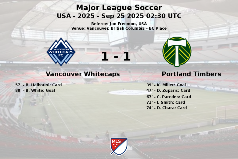 Vancouver, Colombie-Britannique – Les Portland Timbers et les Vancouver Whitecaps ont fait match nul au BC Place dans un match marqué par la tension et les cartons jaunes. Les Timbers ont pris l’avantage à la 39e minute grâce à un but de K. Miller, une avance qu’ils ont conservée pendant une grande partie du match. Cependant, les Whitecaps, dominant la possession avec 59%, ont constamment poussé pour égaliser. Leur effort a été récompensé à la 88e minute lorsque B. White a égalisé le score, scellant le résultat final de 1-1.