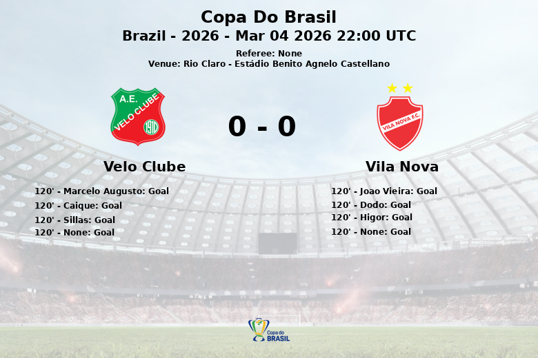Le match, disputé le 4 mars 2026, a été caractérisé par son intensité, reflétée par les cartons jaunes distribués (3 pour Velo Clube et 4 pour Vila Nova). Les deux équipes ont maintenu une possession équitable et un nombre similaire de tirs cadrés et non cadrés, ainsi que de corners et de fautes. Le vainqueur sera désigné lors du match d’appui.
