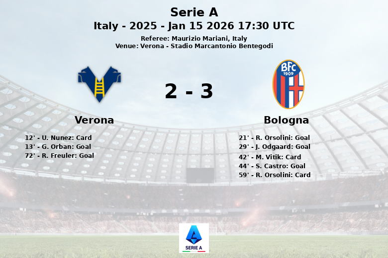 R. Orsolini a égalisé pour Bologne à la 21e minute, assisté par R. Freuler. J. Odgaard a prolongé l’avance à la 29e minute, grâce à une passe décisive de B. Dominguez. Avant la mi-temps, S. Castro a consolidé la domination de Bologne avec un but à la 44e minute, assisté par T. Pobega. Le score final était de 2 pour Vérone et 3 pour Bologne.