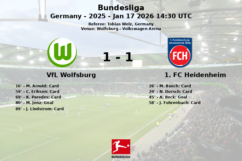 VfL Wolfsburg vs 1. FC Heidenheim Jan 17 2026 14:30 UTC