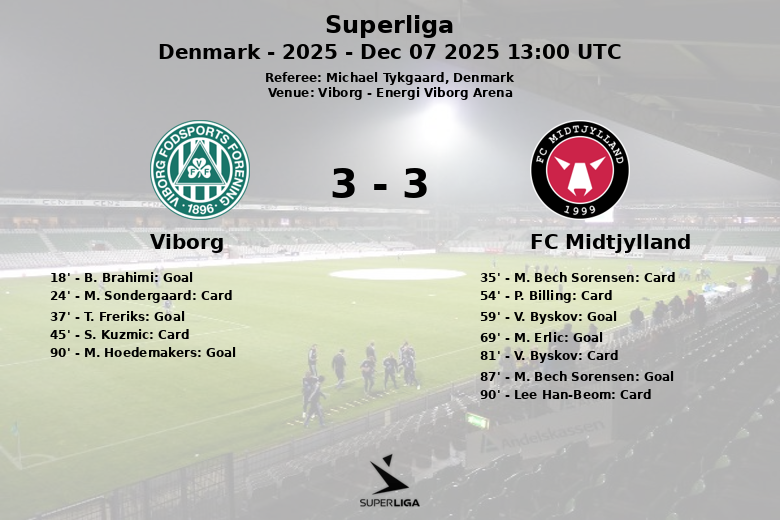 Le FC Midtjylland a réagi en seconde période, réduisant l’écart à la 59e minute grâce à un but de V. Byskov. La pression des visiteurs s’est poursuivie, et M. Erlic a réussi à égaliser le match à la 69e minute, assisté par P. Billing. L’équipe visiteuse a même pris l’avantage grâce à un but de M. Bech Sorensen à la 87e minute, assisté par A. Simsir. Cependant, Viborg n’a pas abandonné et M. Hoedemakers a scellé la victoire dans la dernière minute du temps réglementaire, avec une autre passe décisive de A. Beck.