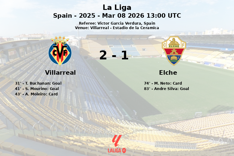 Villarreal a pris l’avantage grâce à un but de T. Buchanan à la 31e minute, sur une passe de P. Gueye. L’avance a été étendue à la 41e minute avec un but de S. Mourino, sur une passe de S. Comesana. Cependant, A. Moleiro a reçu un carton jaune à la 43e minute.