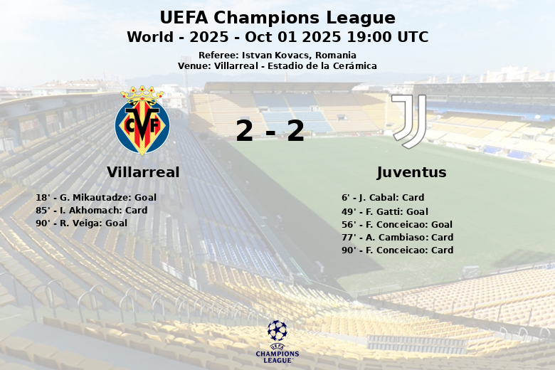 Villarreal n’a pas abandonné et a cherché l’égalisation jusqu’à la fin. Leur pression a porté ses fruits à la 90e minute, lorsque R. Veiga, servi par I. Akhomach, a obtenu le match nul final. Le match a également été marqué par un jeu intense, avec un total de 23 fautes et trois cartons jaunes, deux pour la Juventus (J. Cabal, A. Cambiaso, F. Conceicao) et un pour Villarreal (I. Akhomach). Malgré une plus grande possession de balle de la Juventus et ses 13 tirs, Villarreal a été plus efficace devant le but. Le match nul laisse les deux équipes avec un point dans cette phase de la Ligue des champions.