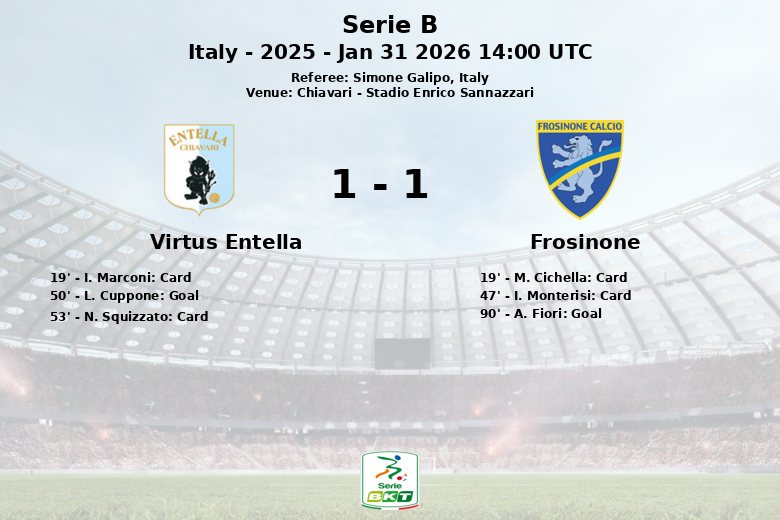 Remplacements dans l’quipe de virtus entella: À la 68e minute, N. Squizzato est entré et M. Dalla Vecchia est sorti., À la 75e minute, L. Cuppone est entré et T. Fumagalli est sorti., À la 75e minute, B. Guiu est entré et D. Bariti est sorti., À la 85e minute, N. Karic est entré et M. Nichetti est sorti.