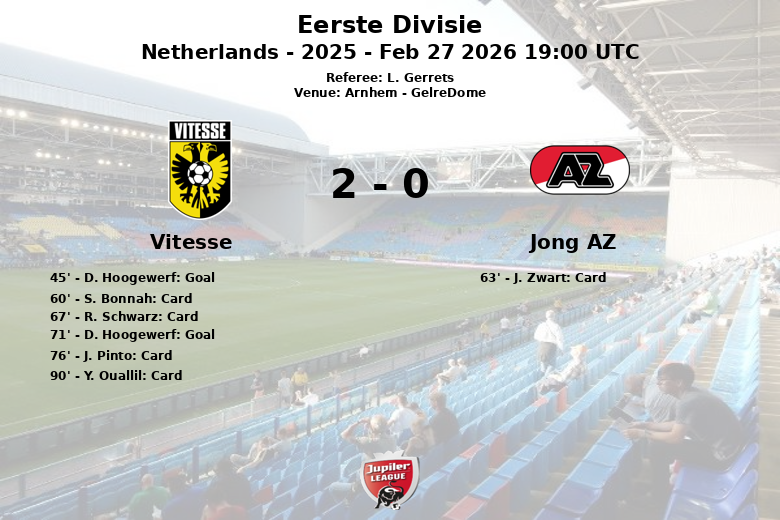 Vitesse a pris l’avantage juste avant la mi-temps, à la 45e minute, grâce à un but de D. Hoogewerf, sans passe décisive apparente. Jong AZ a tenté de réagir après la pause, mais Vitesse a creusé l’écart à la 71e minute, à nouveau avec un but de Hoogewerf, cette fois sur une passe de N. Bannis.
