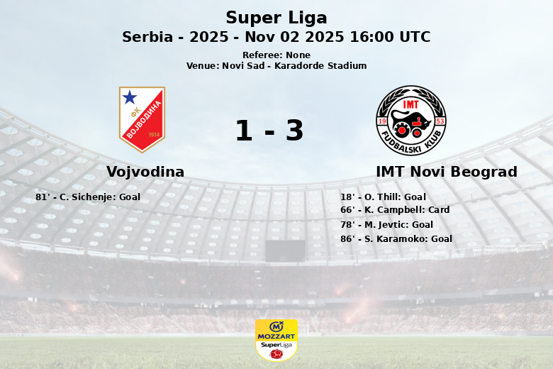 Novi Sad, Serbie – Dans un match vibrant disputé au stade Karadorde, l’IMT Novi Beograd a remporté la victoire contre Vojvodina lors d’un match correspondant à la 14e journée de la Super Liga serbe. Le match, qui s’est déroulé le 2 novembre 2025, a été riche en émotions et en rebondissements.