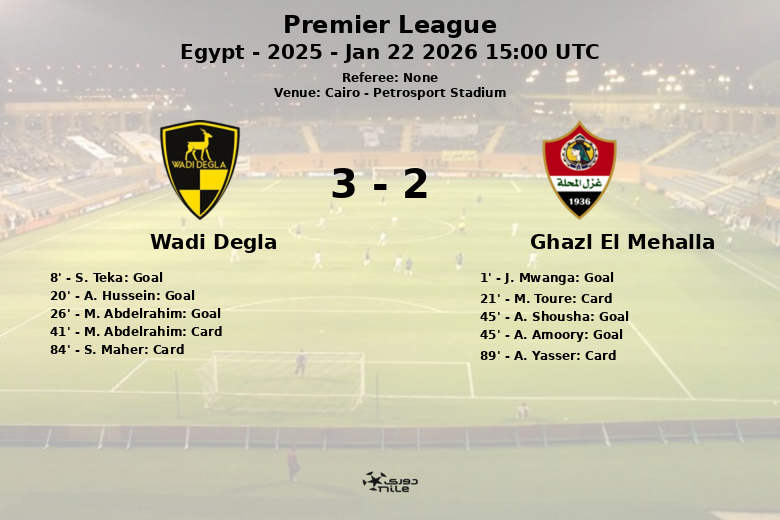 Malgré les efforts de Ghazl El Mehalla en seconde période, ils n’ont pas réussi à égaliser. Le match a été marqué par une forte intensité, reflétée par les cartons jaunes attribués à M. Toure (Ghazl El Mehalla), M. Abdelrahim (Wadi Degla), S. Maher (Wadi Degla) et A. Yasser (Ghazl El Mehalla).