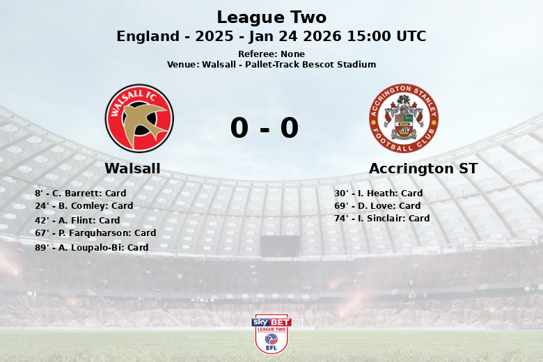 Walsall, Angleterre – Lors d’un match disputé au Pallet-Track Bescot Stadium, Walsall et Accrington ST ont fait match nul dans une rencontre marquée par l’intensité et un grand nombre de cartons jaunes. Le match, comptant pour la 28e journée de League Two, a vu Accrington ST dominer la possession du ballon avec 64 % contre 36 % pour Walsall.