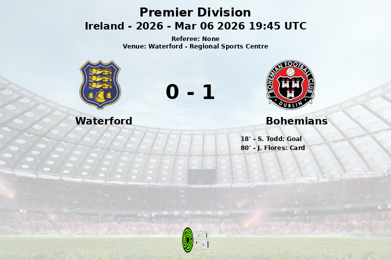 Waterford, Irlande – Lors d’un match disputé au Regional Sports Centre, les Bohemians se sont imposés face à Waterford sur le score de 1 à 0. L’unique but de la rencontre est survenu tôt, à la 18e minute, grâce à une frappe de S. Todd sur une passe décisive de D. Rooney.