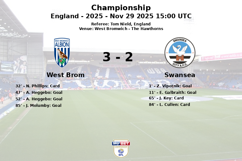 Swansea a tenté de réagir, mais West Brom a dominé la possession (65% de possession) et a créé de nombreuses occasions de but (26 tirs au total). Les efforts des locaux ont finalement été récompensés à la 85e minute par un but de J. Molumby, servi par J. Maja, scellant la victoire pour West Brom. Swansea a vu J. Key et L. Cullen avertis aux 65e et 84e minutes respectivement.