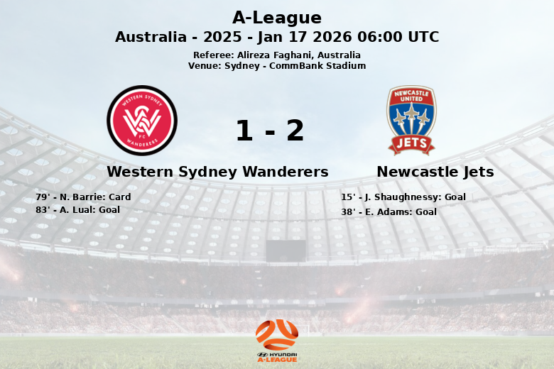 Bien que Western Sydney Wanderers ait dominé la possession du ballon avec 56%, ils ont eu du mal à transformer cet avantage en buts jusqu’à la 83e minute, où A. Lual a marqué avec une passe décisive de A. Pantazopoulos. Malgré la pression finale et les 16 tirs effectués (7 cadrés), l’équipe locale n’a pas réussi à égaliser le score. Le match s’est terminé avec un carton jaune pour N. Barrie de Western Sydney Wanderers. Newcastle Jets a remporté la victoire grâce à une performance efficace, en capitalisant sur ses occasions et en maintenant une défense solide.