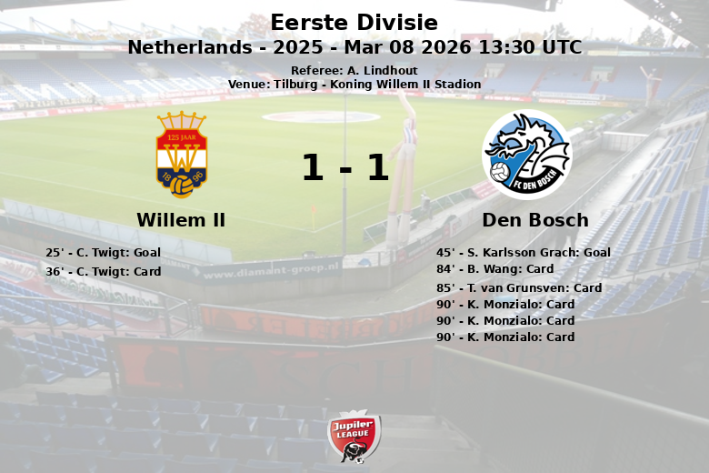 Willem II a frappé en premier à la 25e minute, avec un but de C. Twigt sur une passe de N. Doodeman, déclenchant l’euphorie dans les tribunes. Cependant, Den Bosch n’a pas baissé les bras et a trouvé l’égalisation juste avant la mi-temps, à la 45e minute, grâce à un but de S. Karlsson Grach servi par K. Monzialo.
