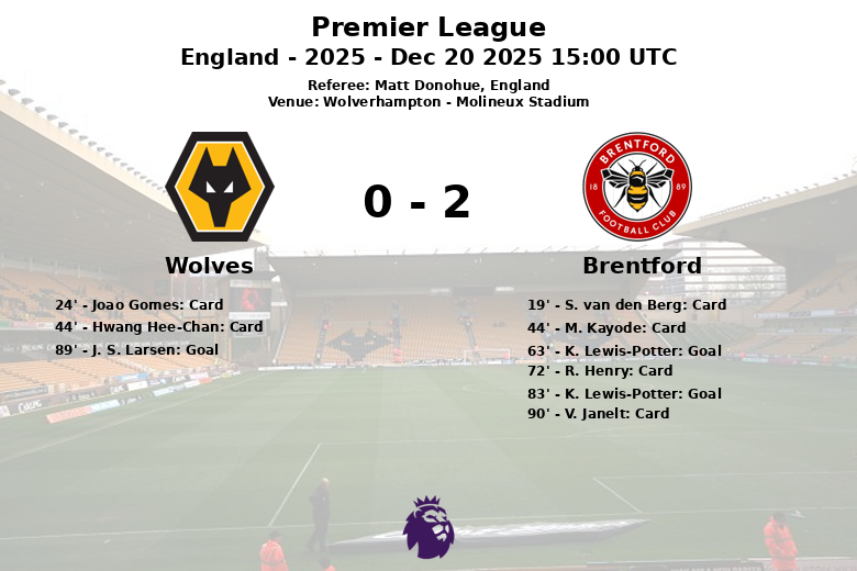 Wolverhampton, Angleterre – Dans un match disputé au Molineux Stadium, Brentford a battu Wolverhampton sur le score de 2 à 0, grâce à une performance remarquable de Kevin Lewis-Potter, qui a marqué les deux buts de son équipe. Le match, comptant pour la 17e journée de Premier League, a été marqué par l’intensité et une accumulation de cartons jaunes.