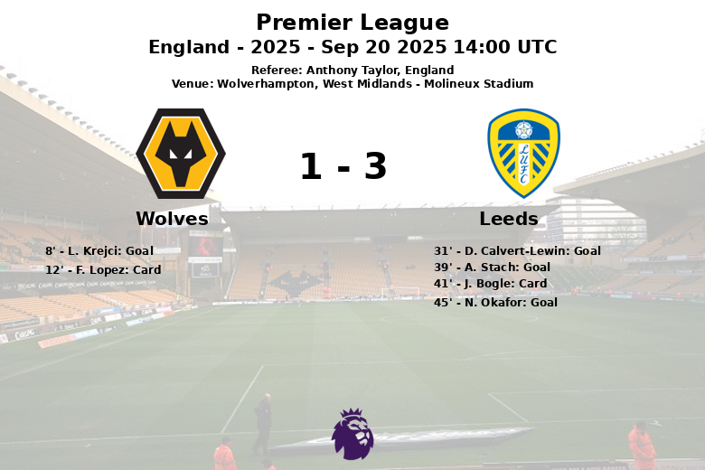 Les Wolves ont commencé fort, ouvrant le score à la 8ème minute grâce à un but de L. Krejci, sur une passe décisive de F. Lopez. Cependant, leur joie fut de courte durée. Leeds a réagi avec force, égalisant à la 31ème minute avec un but de D. Calvert-Lewin. Le retournement de situation s’est confirmé à la 39ème minute avec un but de A. Stach, et N. Okafor a creusé l’écart à la 45ème minute.