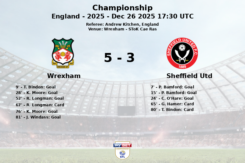 Sheffield Utd a commencé fort, avec Patrick Bamford marquant aux 7ème et 15ème minutes, assisté à chaque fois par F. Seriki. C. O’Hare a creusé l’écart à la 24ème minute. Cependant, Wrexham n’a pas baissé les bras et a répondu avec des buts de K. Moore (28′, 76′) et R. Longman (52′), assistés par G. Thomason et N. Broadhead respectivement, et avec un but contre son camp de T. Bindon à la 9ème minute. Le match a atteint un point culminant dramatique avec un but sur penalty de J. Windass à la 81ème minute.