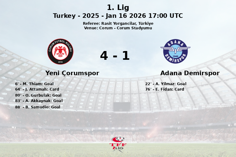 Yeni Çorumspor vs Adana Demirspor Jan 16 2026 17:00 UTC