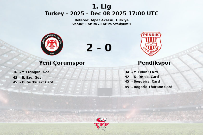 Le score a été ouvert à la 16e minute grâce à un but de Y. Erdogan, assisté par O. Gurbulak, donnant une avance précoce à l’équipe locale. Yeni Çorumspor a creusé l’écart juste avant la mi-temps, à la 42e minute, avec un but de E. Eze, assisté par J. Attamah.